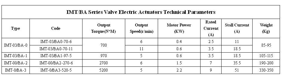 IMT/BA series , the combination of IMT series and BA cone gear reducer, are small and medium size multi-turn valve electric actuators. They are used to drive multi-turn actuators such as gate valves and stop valves. Through the combination of IMT series and BA cone gear reducer, customers can get bigger output torque. On the allowable condition of output speed, this series can improve actuators' generality so that can be used easily.
